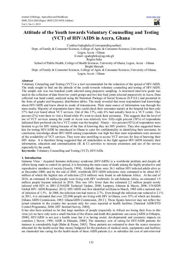 Voluntary counselling and testing and should focus on facilitating conditions surrounding Sewankambo NK, Swerwaadda D, Makumbi F, Lutalo T, & Gray RH. (2001). Population-based HIV counselling and testing in rural Uganda: Participation and risk characteristics. Journal of Acquired Immune ... Read More